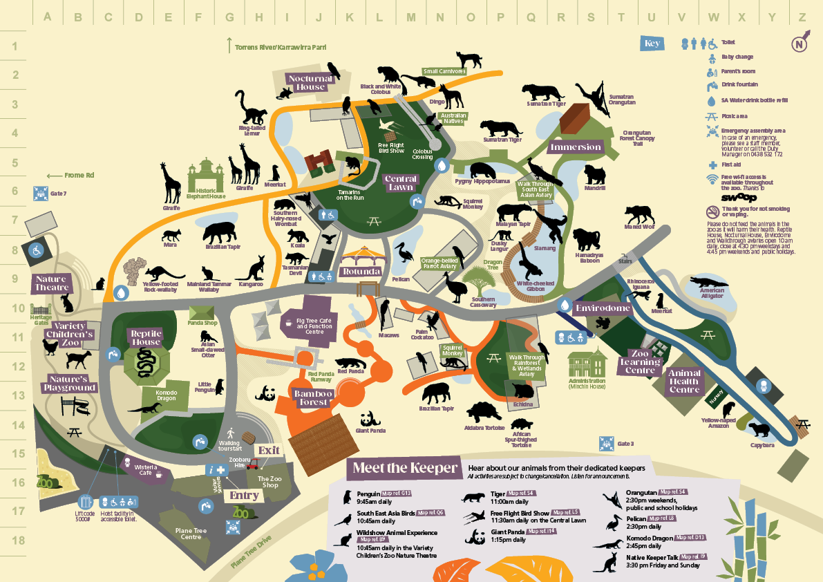 Adelaide Zoo retains many of its original buildings and features, in which some are state heritage listed places. Our walkways and trails are accessible for individuals with wheelchairs, please refer to the map key to familiarise yourself with the location of the only stair case within the zoo.